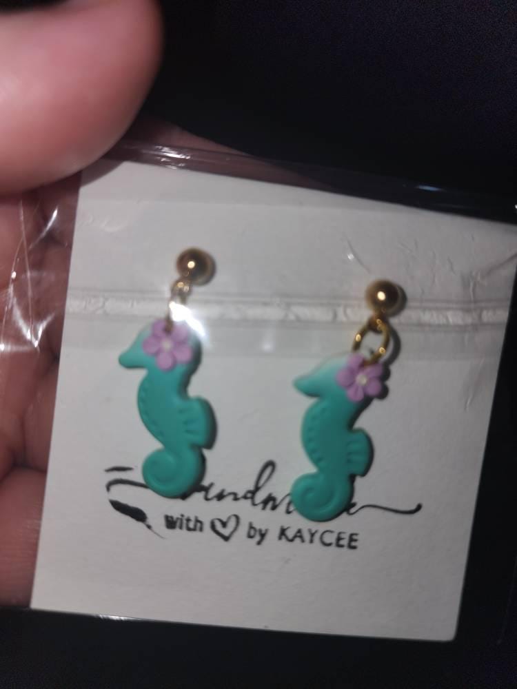 Adorable ombré seahorse earrings. Blue and purple details. Attached to a gold ball post.